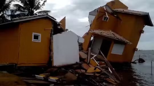 Segundo relatos de moradores, há 10 anos, a faixa de areia ficava a cerca de 800 metros de distância, mas o avanço do mar tem comprometido cada vez mais casas.