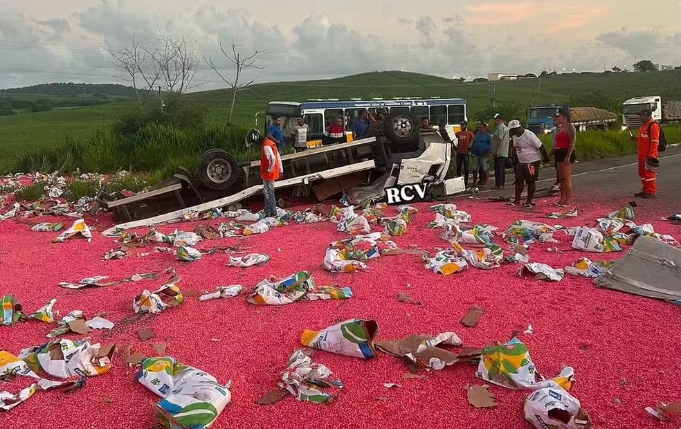 Ele conduzia um caminhão que transportava sementes de milho, quando perdeu o controle do veículo e colidiu contra a mureta que separa as vias. A carga ficou espalhada pela pista.