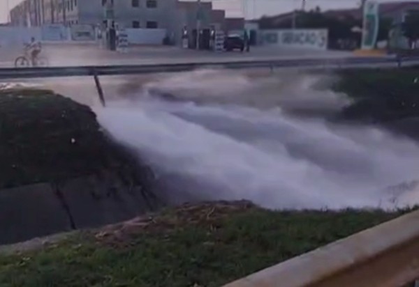 Imagens registradas por moradores mostram um grande volume de água saindo da tubulação e atingindo a via pública.